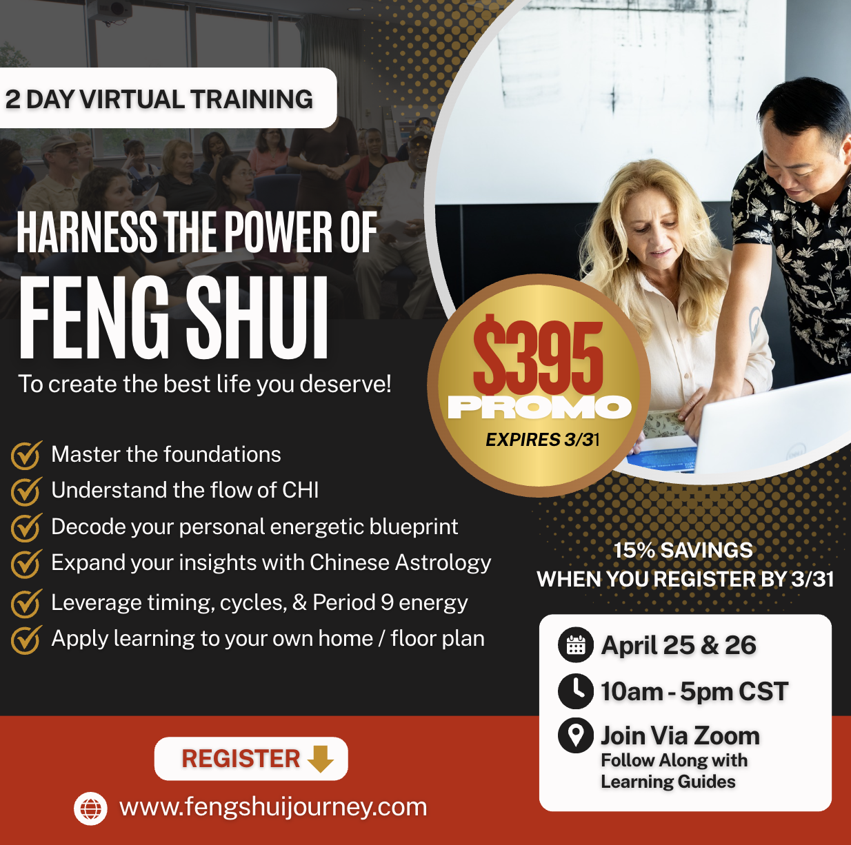 All participants will receive a comprehensive participant guide and the full training presentation to support their learning and implementation after the program. In addition, we will host 30-day and 60-day cohort Zoom regroup sessions where participants can reconnect, ask questions, share progress, and gain deeper insights as they begin applying Feng Shui principles in their homes and lives.